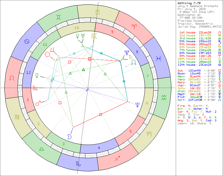 This round of protests is being organized by Women’s March, an organization that promotes feminist economies, inclusive democracy, and racial equity. Protests begin at 9 AM on the east coast. The horoscope is set for Washington, D.C., 9 AM, on July 4, 2025.