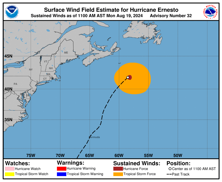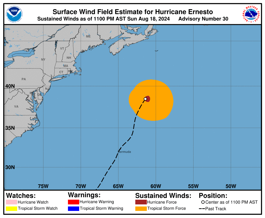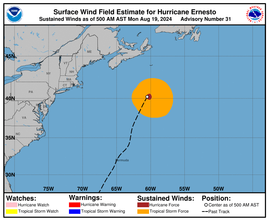 Maps of the eye of Hurricane Ernesto show that it was at 38° Latitude around 11 PM on August 18 and moved in a northwest direction to 40° by 5 AM on the 19th. The Bayesian yacht sank around 4:15 AM UTC+1 on August 19, latitude ~38.1°N