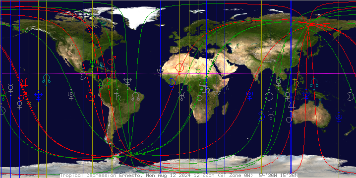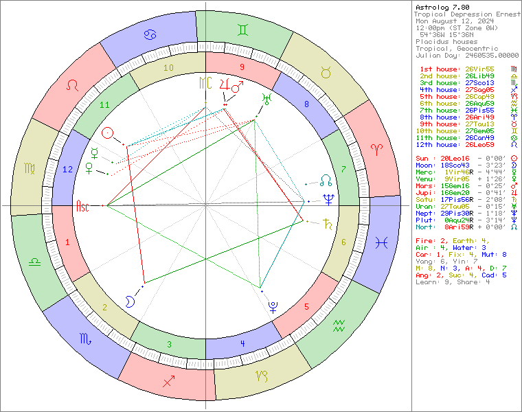 I am presenting a slightly different chart for Hurricane Ernesto than I did in the previous post. The reason being, I have learned, in the interim, that some points and stars are very useful when parsing information from charts. Additionally, there should be consistency with my determination of the birth of a hurricane. The formation of tropical depression Ian worked well as a marker with future discernment of storms. Therefore, I will be using tropical depression information for Ernesto in this analysis.