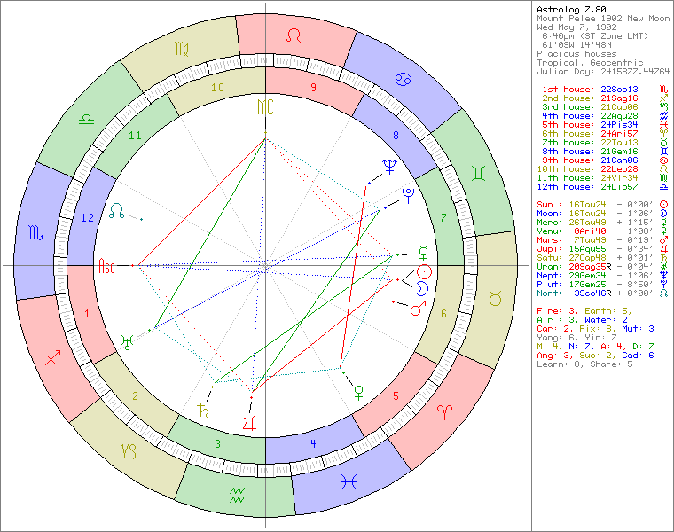Neptune was in the eighth house of the 1902 New Moon chart for the 7.0 M volcanic eruption on May 8, 1902; meeting my earthquake prediction criteria. I do think criteria for eruptions and earthquakes differ. The eight house Neptune location appears to be something the two have in common.