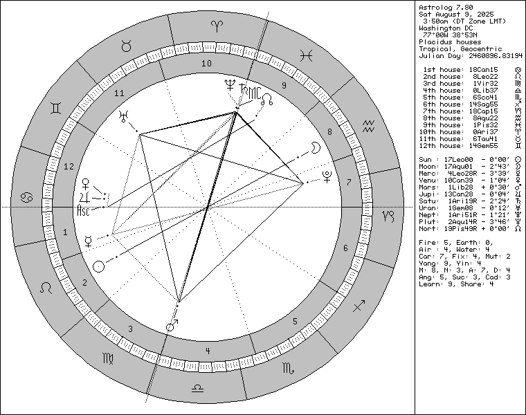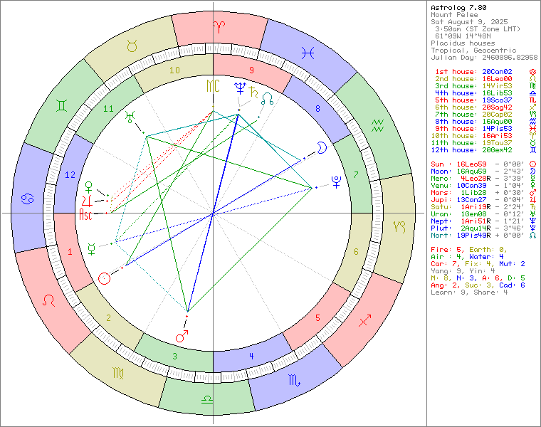 The August 9 2025 Full Moon chart for the Washington DC longitude/latititude has Mars as the release planet. Mars is in the fourth house of land and conjunct the Imum Coeli (national roots). Mars at 1° in cardinal sign Libra satisfies two benchmarks commonly associated with 6M+ earthquakes in Sun/Moon charts. Its opposition to Saturn adds further support. While Saturn and Neptune are placed in the 10th house, outside the typical parameters, the presence of a debilitated Mars in the 4th house, forming a hard aspect, may still be sufficient to signal seismic activity. I think Mount Pelee, which is in the same time zone as Washington DC, is more likely to have a 6.0+M earthquake, as Saturn is in its Full Moon’s ninth house.