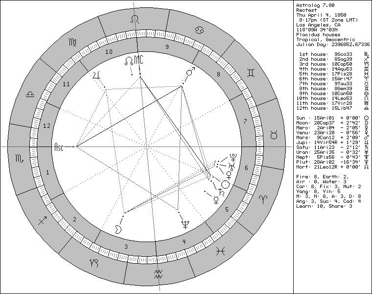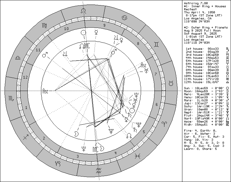 Determining what area with Saturn in the 11th chart is more likely to experience an earthquake, I think, may be possible by comparison of the Full Moon chart to the area chart. I have only a rectification test (rectest) chart for Los Angeles. There are major aspects between the Los Angeles rectest chart and its full moon chart. Without charts for the other locations, I cannot confirm that Los Angeles is the most likely area for an earthquake, should one occur. Comparison aspects are below.