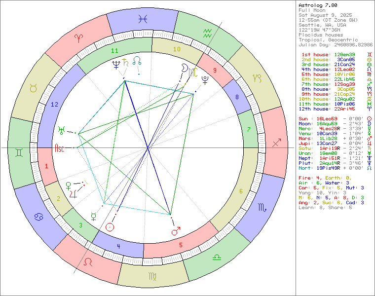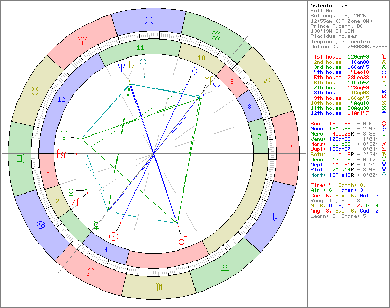 The planets in the horoscope of the Full Moon on August 9, 2025 form a kite pattern. My personal experience of a transiting kite pattern is one of protection. Last year, I went out on a day when transits to my natal chart warned of risks tied to travel and communication. Yet, during the brief window of a kite formation, it felt as if I were wrapped in an invisible shield. I moved through the hours with ease. But as soon as that shield lifted, reality returned, abruptly reminding me to be vigilant once again.
