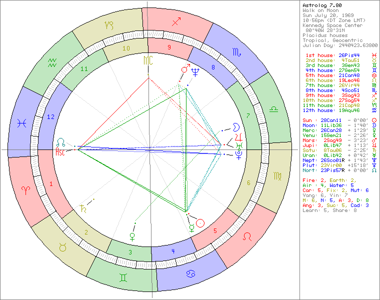 I did not find references to kite patterns in mundane charts, so I searched the mundane charts in my records to help with defining how kite patterns manifest. I found only one chart containing a kite pattern, the Walk on the Moon horoscope. I will apply the essential elements from Gettings’ description to interpret the chart.