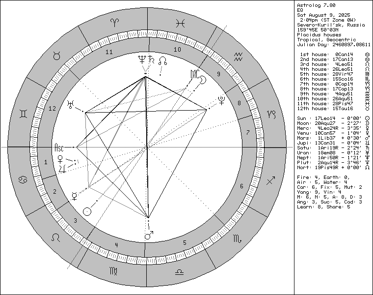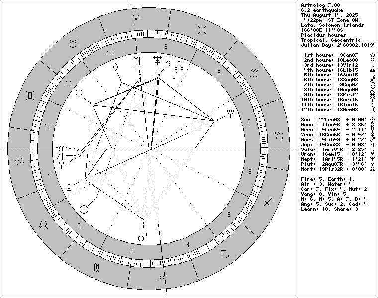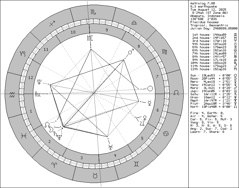 | 6.0 M earthquake Severo-Kuril’sk, Russia * Saturn/ Neptune in 11th house. Mercury conjunct 3rd house cusp, Mars in 4th, Pluto in 8th, – planetary triggers | 6.1 M earthquake Bigadic, Turkey * Uranus conjunct IC, Mars in 8th – planetary triggers |