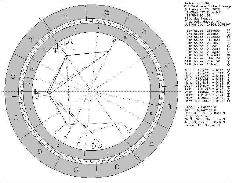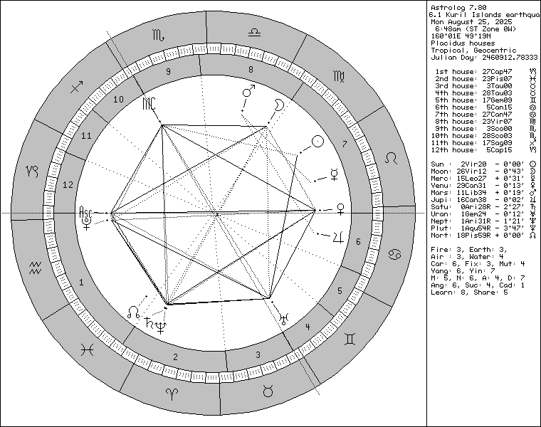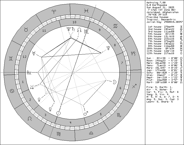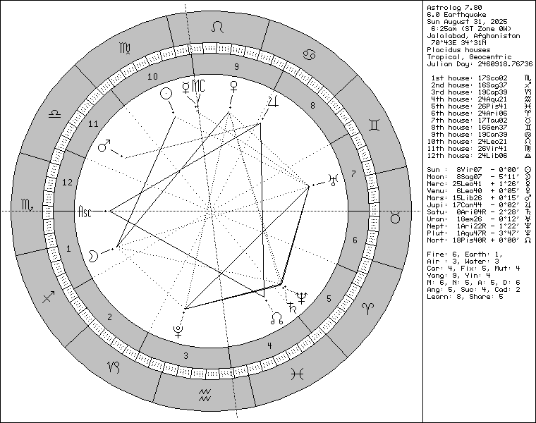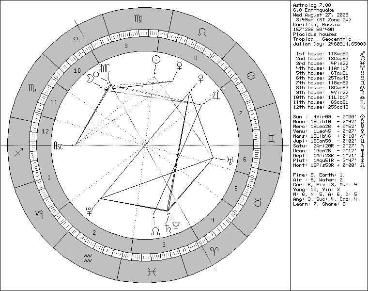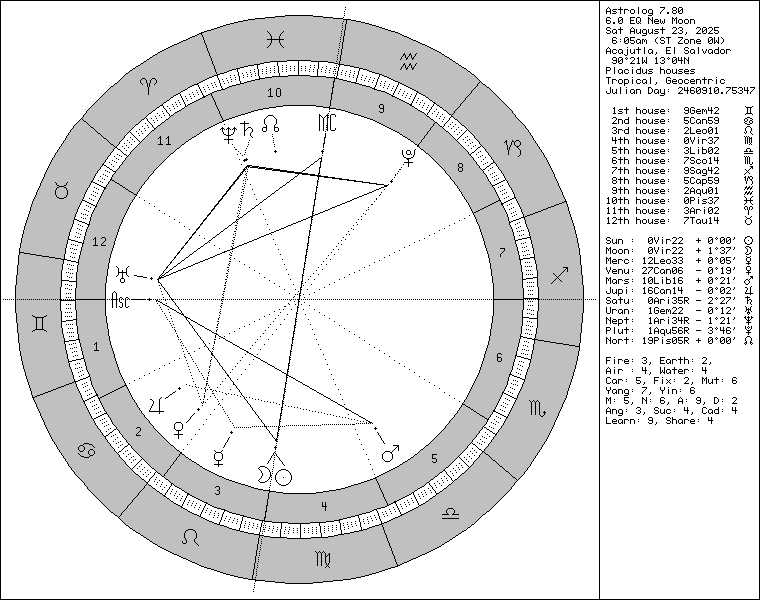 Earthquake predictive Sun/Moon chart criteria as of August 23, 2025: Saturn in 9th or 11th house, Neptune and Node in 8th house, heavy cardinal sign emphasis, stellium in Sun/Moon sign, degrees clusters at 0-5 or 25-29, Mars/Saturn within 5° or in hard aspect to Sun/Moon, 28° Virgo rising.