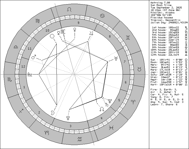 Trine Sun/Moon for Nikolski Alaska earthquake’s longitude/latitude. Moon square Mars.