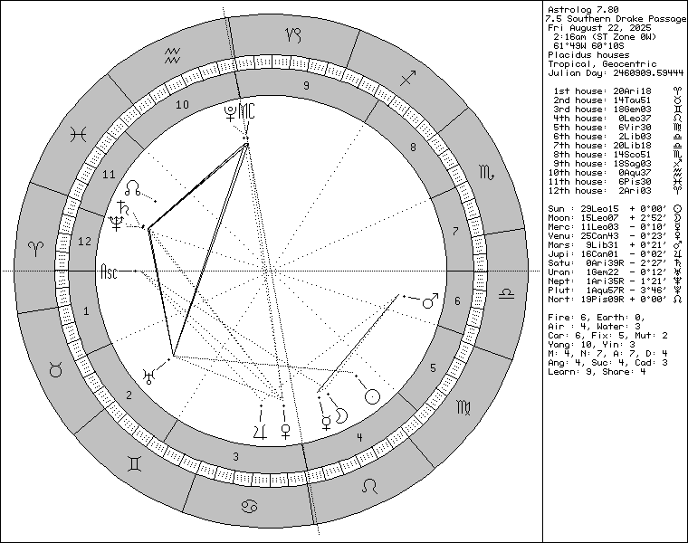 New Moon chart for Southern Drake Passage earthquake’s longitude/latitude. Saturn in 9th house. Sun/Moon at 0°.