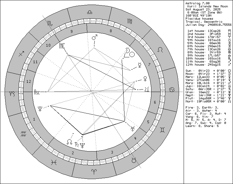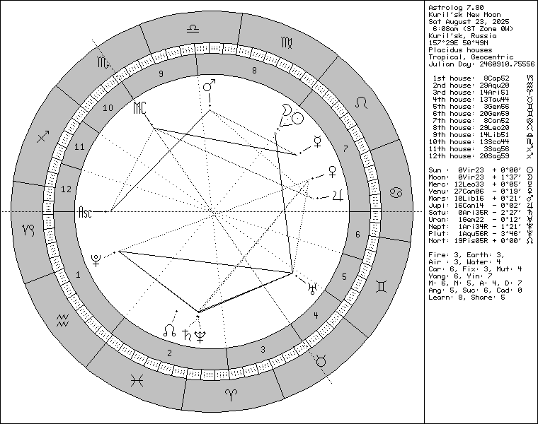 New Moon chart for Kuril’sk Russia earthquake’s longitude/latitude. Sun/Moon at 0°.