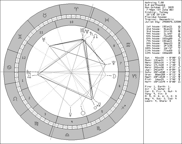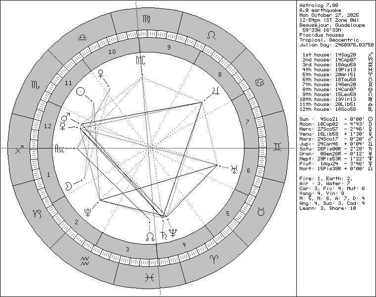 Earthquake Triggers (from earthquake overlay page): 3rd house – Mercury and Pluto; 4th house – Venus, Uranus, and Mars; 5th house – Moon and Pluto; 6th house – Uranus and Sun; 7th house – Neptune, Saturn, and Pluto; 8th house – Mars, Uranus, and Pluto; 10th house – Moon and Saturn; 11th house – Uranus and Jupiter; 12th house – Neptune and Mars.