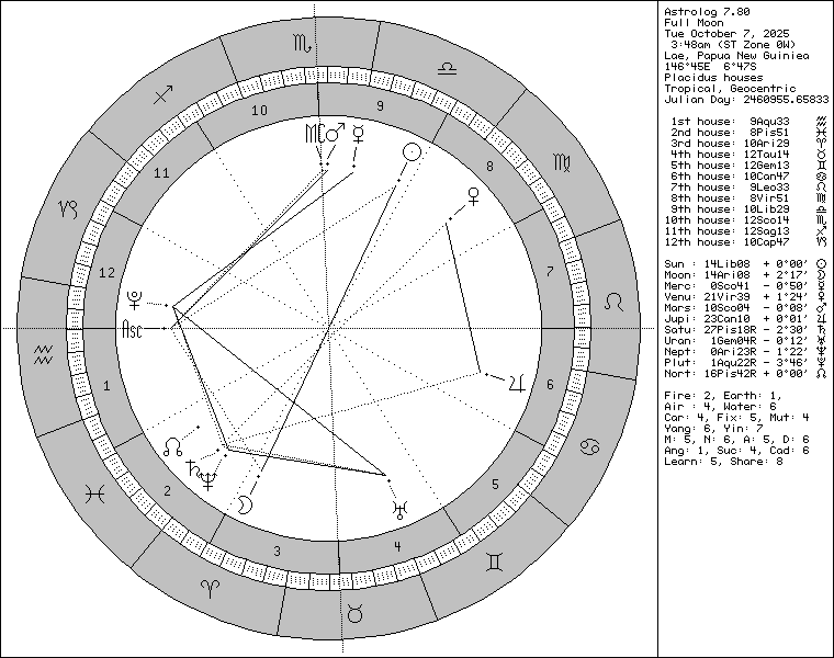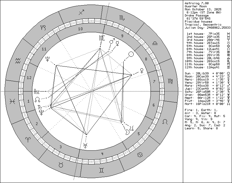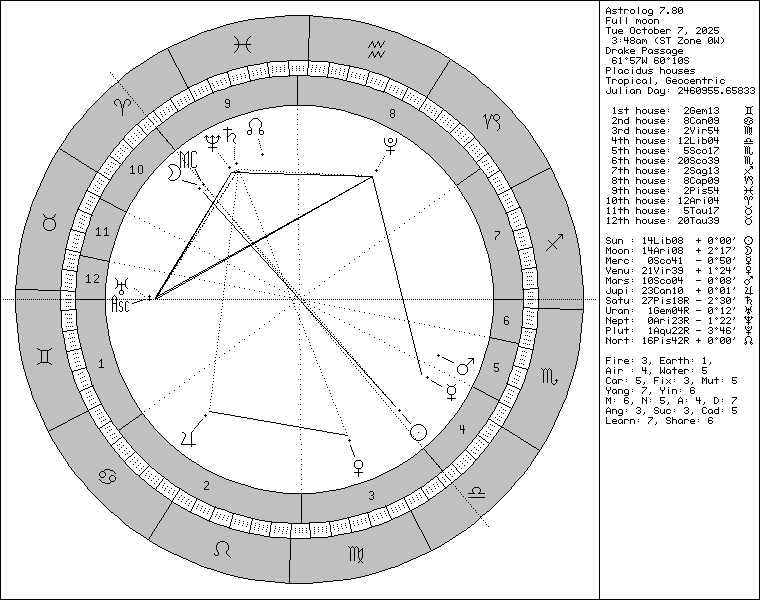 Full Moon chart for Drake Passage longitude/ latitude. Saturn in 9th house.