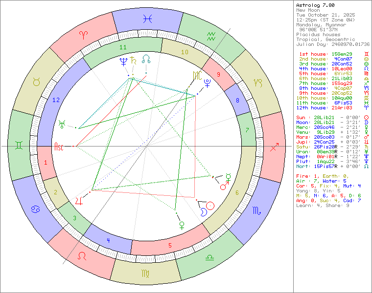 New Moon chart for Mandalay, Myanmar longitude/ latitude. Saturn in 11th house. Sun/Moon at 28°.