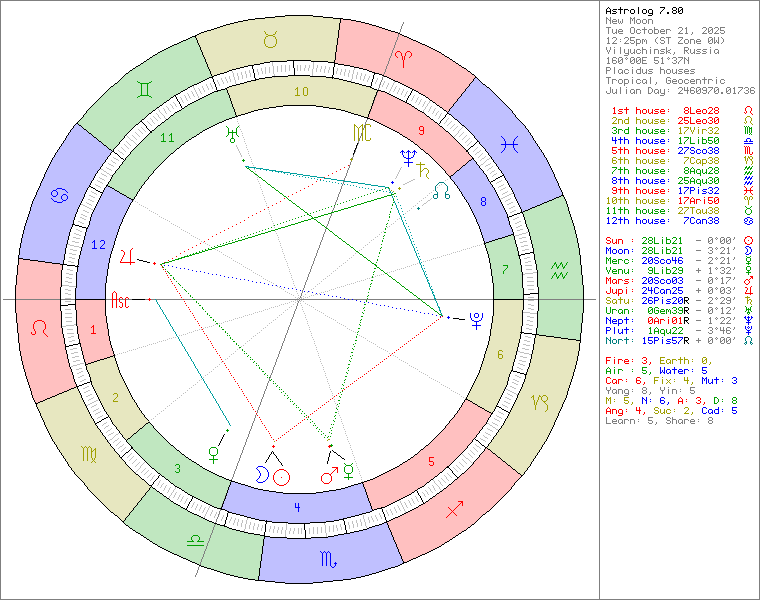 New Moon chart for Vilyuchinsk, Russia longitude/ latitude. Saturn in 9th house. Node in 8th house. Sun/Moon at 28°.