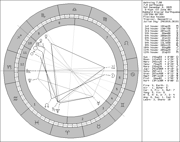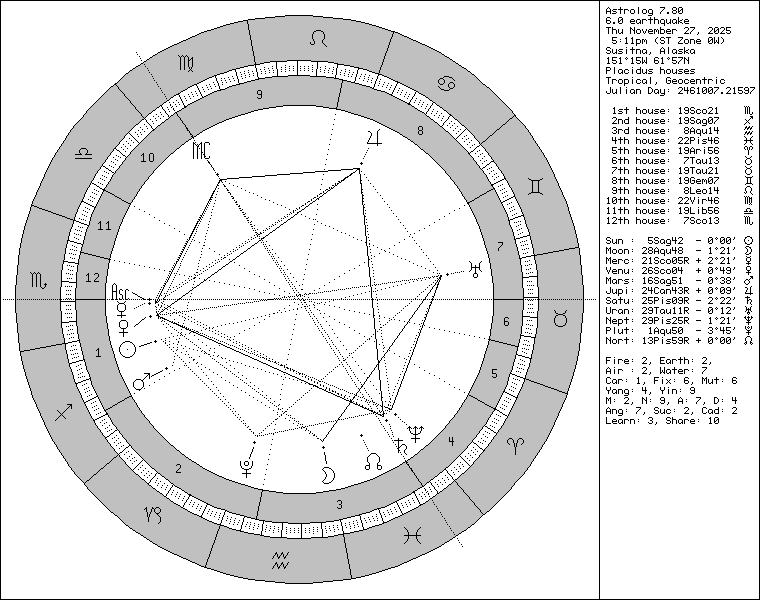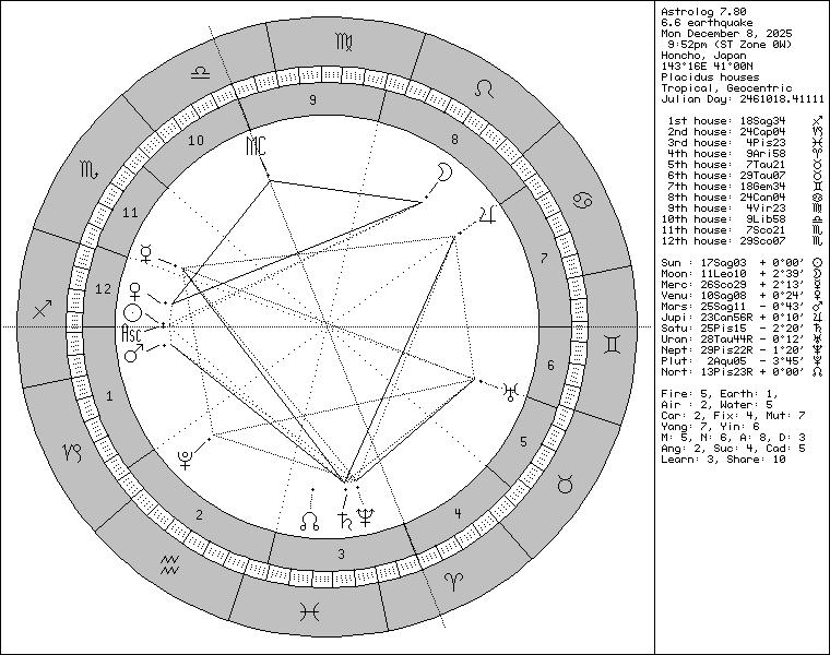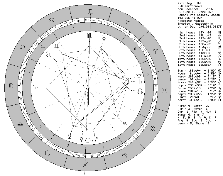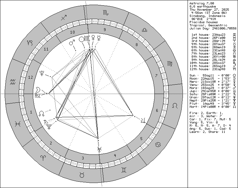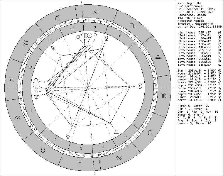 Earthquake Triggers (from earthquake overlay page): 3rd house – Mercury and Pluto; 4th house – Venus, Uranus, and Mars; 5th house – Moon and Pluto; 6th house – Uranus and Sun; 7th house – Neptune, Saturn, and Pluto; 8th house – Mars, Uranus, and Pluto; 10th house – Moon and Saturn; 11th house – Uranus and Jupiter; 12th house – Neptune and Mars.