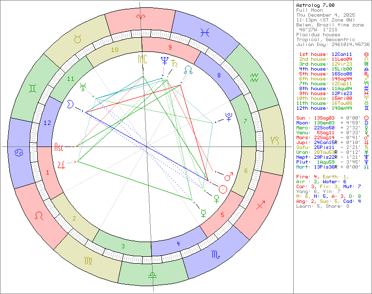 Full Moon chart for Belem, Brazil longitude/ latitude. Saturn in 9th house.