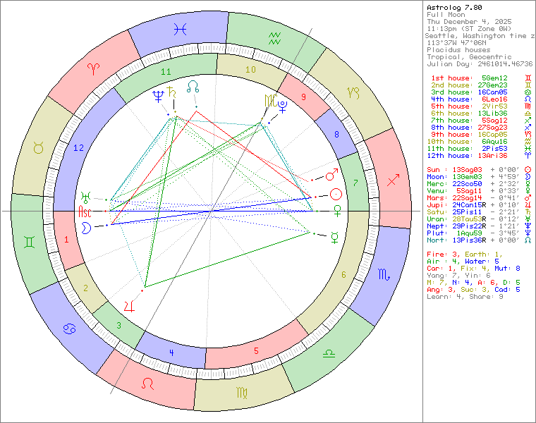 Full Moon chart for Seattle, Washington longitude/ latitude. Saturn in 11th house.