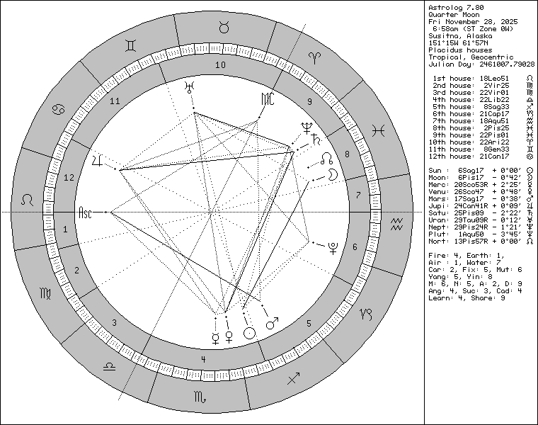 Quarter Moon chart for Susitna, Alaska longitude/latitude. Saturn in 9th house. Node in 8th house.